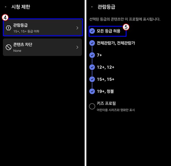 - ‘시청 제한’으로 들어가신 다음 '모든 등급 허용’으로 변경하세요.