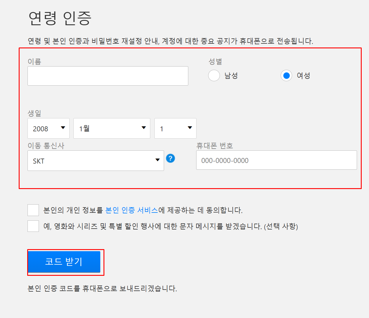 - 개인정보를 입력한 후 코드받기를 클릭해 문자로 전송된 인증번호를 입력합니다.
